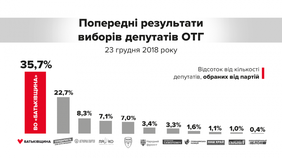 Натомість партія «Батьківщина» від виборів до виборів лише збільшує народну підтримку. Так, політична сила Юлії Тимошенко перемогла в кожній з 7 хвиль виборів в ОТГ, здобувши 30% від кількості депутатів, обраних від партій. А також у цілому демонструє переконливу динаміку.