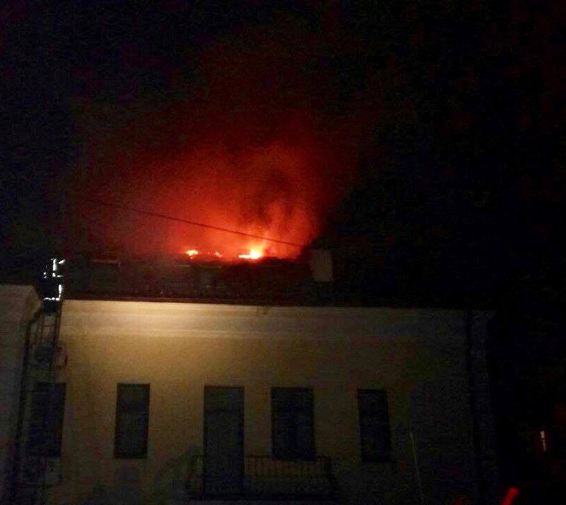 На місці події присутні пожежники і спецтехніка. За попередніми даними займання сталося на горищі будинку, бо палає дах приміщення Приватбанку.
