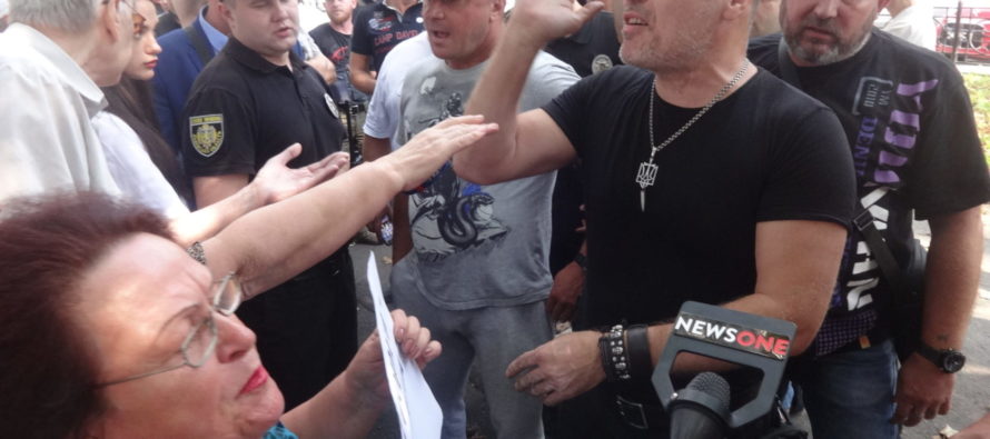 Під час цієї промови до пікетувальників підійшли кілька десятків представників « Національних дружин», «Національного корпусу» та «Української спілки учаснкиів АТО». Учасників акції від націоналістів відгородили спецпризначенці Нацполіції, однак це не завадило активістам з обох сторін активно один одного лаяти.