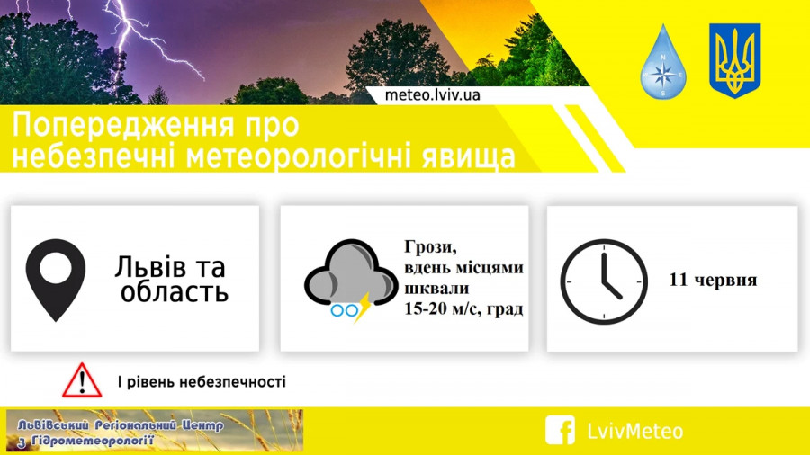 По території Львівської області – 11 червня вночі та вранці значні, по півдню території сильні дощі. Грози, вдень подекуди шквали 15 – 20 м/с, град (ІІ рівень небезпечності, помаранчевий)