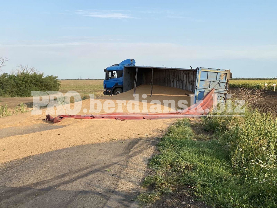 У Бердянському районі перекинувся завантажений автомобіль Scania. На щастя, ніхто не постраждав, але близько 30 тонн зерна розсипалося на трасі.