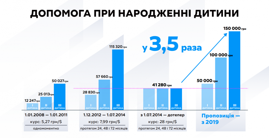 Після перемоги Юлії Тимошенко виплата при народженні першої дитини становитиме 50 тис. грн, другої – 100 тис. грн, а після народження третьої і більше – сума сягатиме 150 тис. грн.