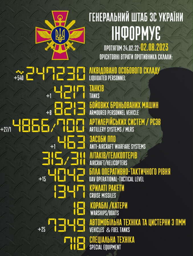 Загальні бойові втрати противника з 24.02.22 по 02.08.23 орієнтовно склали: