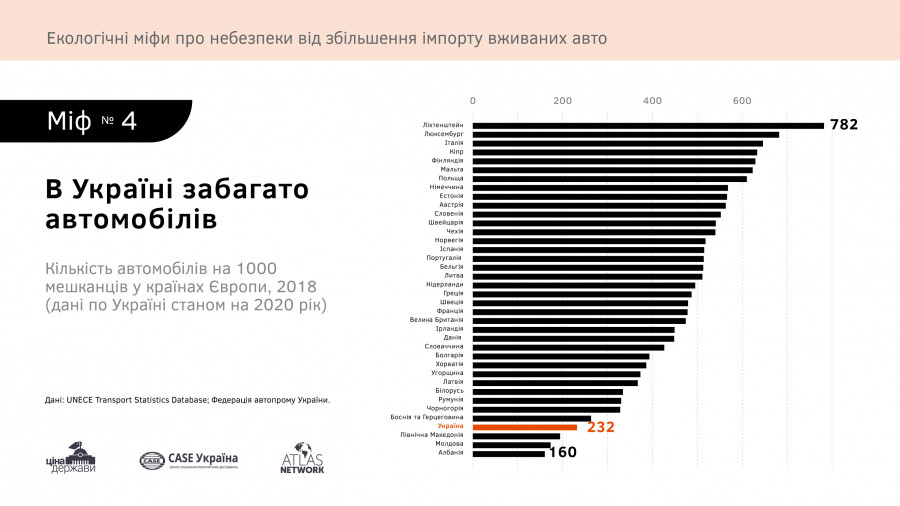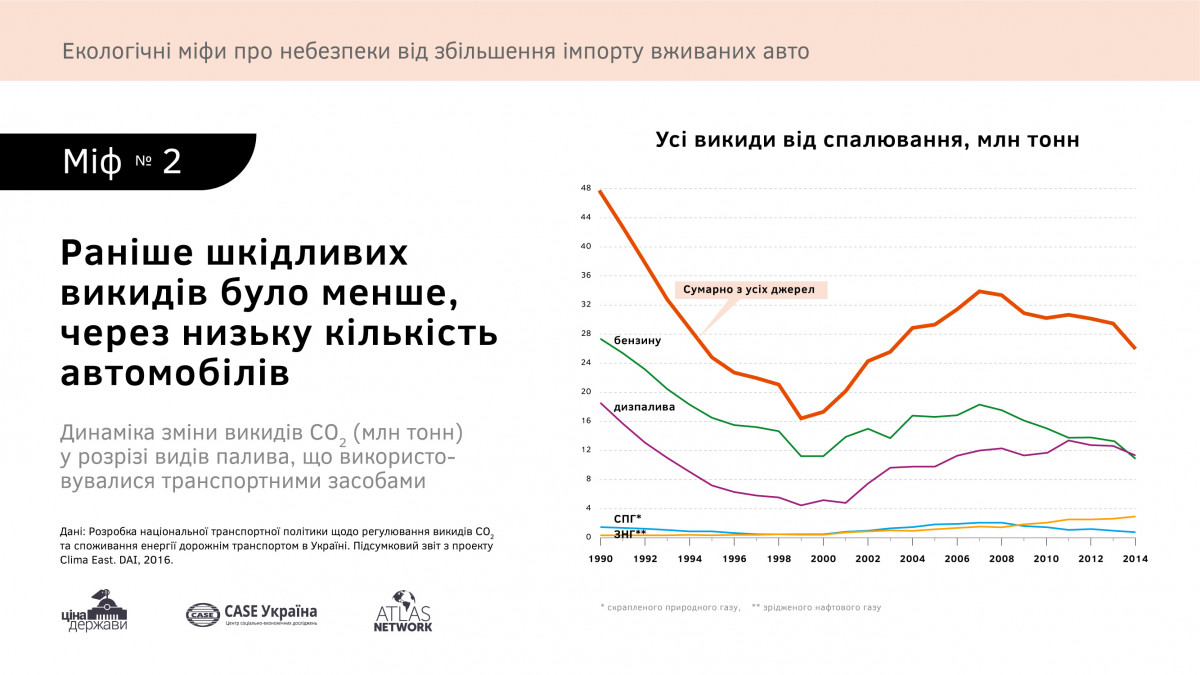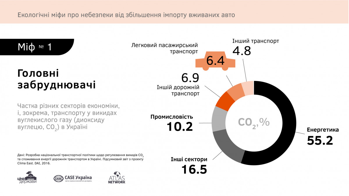 Також експерти розвінчали міф щодо негативного впливу вживаних імпортованих авто на навколишнє середовище. По-перше, порівняно з Європою в нас дуже маленький автопарк – на 1000 громадян припадає 232 автівки, тоді як в Європі цей показник знаходиться на рівні 600 автомобілів. По-друге, більше 28 % нашого автопарку це – радянські і пострадянські старі карбюраторні автівки, викиди від яких уп’ятеро-восьмеро разів перевищують найнижчі євро стандарти. І саме їх передусім витіснятиме імпорт вживаних автомобілів, тож кількість викидів зменшуватиметься навіть зі зростанням кількості автомобілів. І, по-третє, український легковий автопарк створює лише 6,5 % всіх викидів у нашій країні. Основним забруднювачем повітря є енергетичний сектор, який продукує 55,2 % викидів.