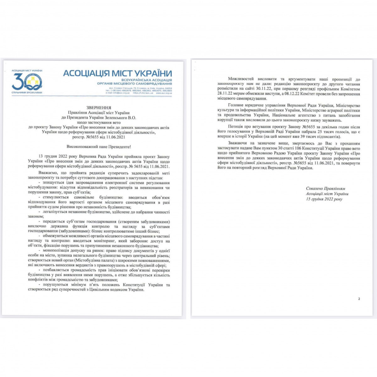 Асоціація міст України звернулася до Президента України Володимира Зеленського про застосування ним права вето щодо прийнятого Верховною Радою України проєкту Закону України «Про внесення змін до деяких законодавчих актів України щодо реформування сфери містобудівної діяльності» №5655 від 11.06.2021.