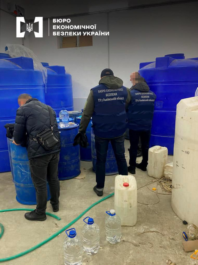 Під час огляду вантажного мікроавтобуса біля одного з відділень поштової служби, а також в приміщенні, де виготовлявся контрафакт, детективи БЕБ виявили та вилучили близько 5500 літрів підробки.