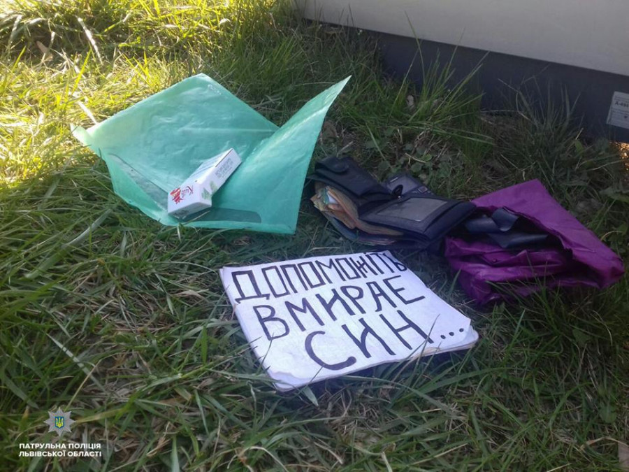 Коли чоловік побачив інспекторів то почав йти геть, проте, його зупинили. В руках чоловік тримав табличку з надписом – «Допоможіть вмирає син».