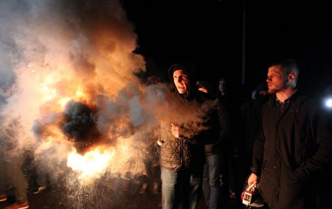 На місці присутні близько сотні поліцейських. За парканом знаходиться така ж кількість чоловіків спортивної зовнішності.