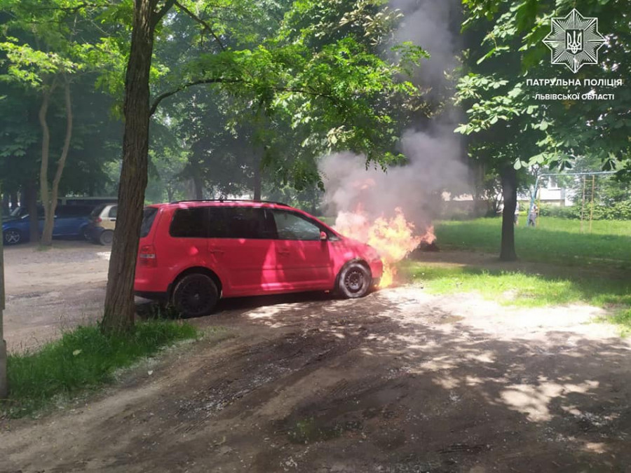 На вулиці Стрийській між двома багатоповерхівками патрульні Віталій Муха та Михайло Теремко виявили загоряння автомобіля Volkswagen Touran. Вогонь швидко поширився й передня сторона автівки деформувалася на очах.