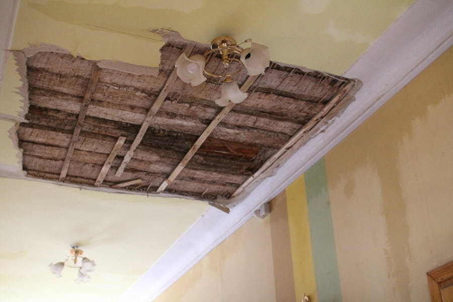 На світлинах помітно, що через зливу, яка накрила місто у неділю, 16 червня, у школі протік дах. Через це подекуди обвалилася штукатурка зі стелі та конструкції з гіпсокартону. Вода пошкодила стіни, парти, книжки тощо.