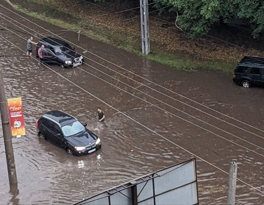 У зв’язку з негодою частина електротранспорту в місті тимчасово не курсує, частина міста без світла, а на дорогах утворилися ріки з води