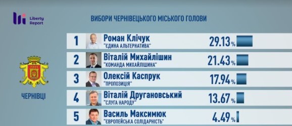 Деталі: За даними екзит-полу Клічук набирає 29,13% голосів, Віталій Михайлішин від партії "Команда Михайлішина" другий із 21,43%.