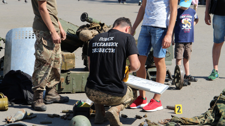Представники гуманітарної місії реконструювали два блокпости — українських військовослужбовці та незаконних збройних формувань, що стоять один на проти одного. Всі об'єкти, що представлені на інсталяції, були знайдені пошуковими системами. На площі вони виставлені в такому порядку, який максимально точно відображає реальну картину наслідків бойових дій. Замість трупів, які були виявлені на позиціях - муляжі.