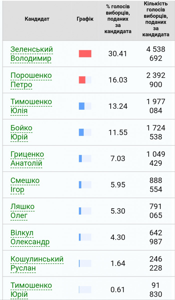 Володимир Зеленський - 30,41% (4 538 692 виборці);