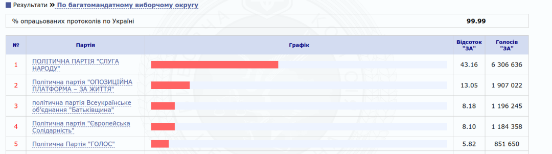 Центральна виборча комісія опрацювала 99,99% електронних протоколів щодо підсумків голосування у багатомандатному загальнодержавному виборчому окрузі на позачергових виборах народних депутатів України.