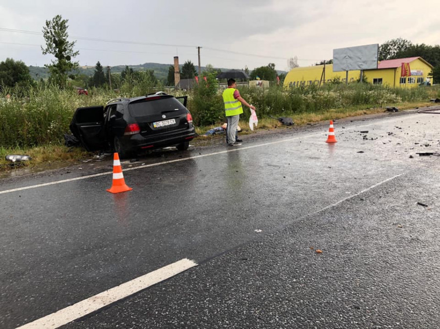 Зіткнулись вантажний автомобіль "Вольво" та легковик "Фольксваген Гольф". Внаслідок зіткнення водій легкового авто загинув на місці події.