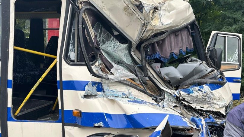 За попередньою інформацією, автобус БАЗ, що виконував рейс міжміського значення, зачепив бік вантажівки Volvo. Унаслідок удару передня частина маршрутки зазнала значних пошкоджень.