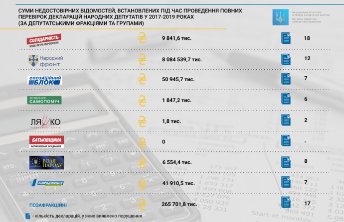 Національне агентство з протидії корупції за результатами перевірок за 2017-2019 роки виявило в деклараціях народних депутатів недостовірні відомості на 8,5 млрд гривень.