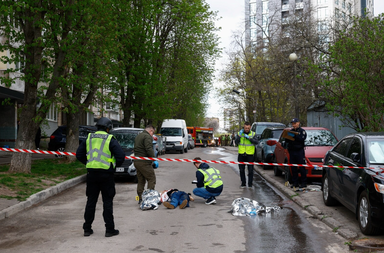 Поліція обстежує тіла загиблих від рук нападника у Києві, 18 квітня 2026 року