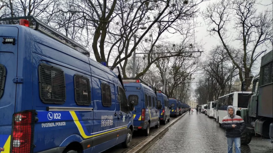 На проспекті припарковано десятки поліцейських автозаків, бусів та інших спецмашин. Вони розміщені по периметру так званої клуби. У такий спосіб створено закриту зону.