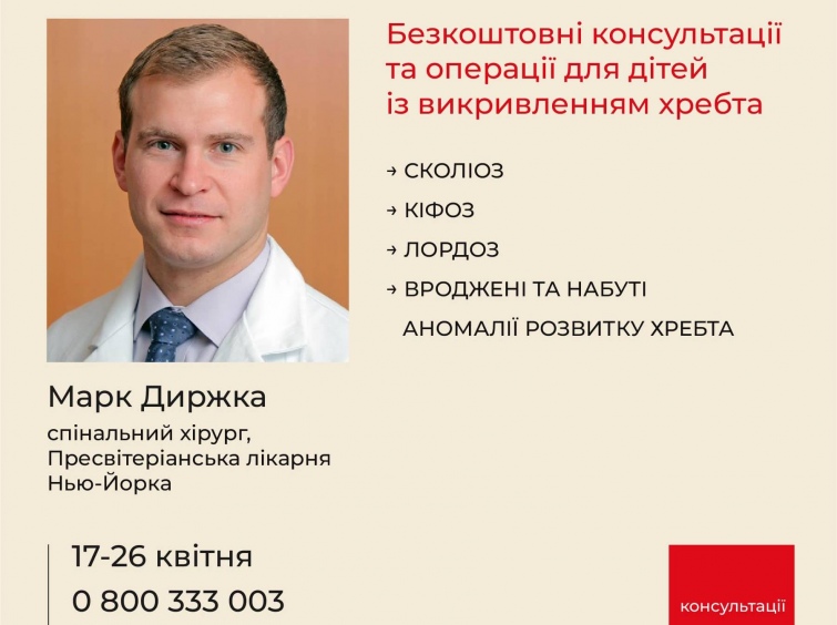 До Львова на 10 днів приїде спінальний хірург із Нью-Йорка Марк Диржка, який допомагатиме українським медикам лікувати дітей із захворюваннями хребта. З 17 по 26 квітня американський хірург працюватиме разом із українською командою ортопед-травматологів та нейрохірургів.