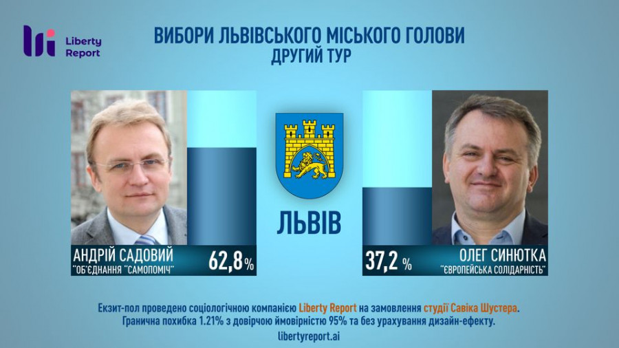 Садовий - 62,8%, Синютка - 37,2%, - такі результати екзитполу другого туру виборів міського голови міста Львова (що пройшов сьогодні, 22 листопада), проведеного соціологічною компанією Liberty Report на замовлення студії Савіка Шустера.