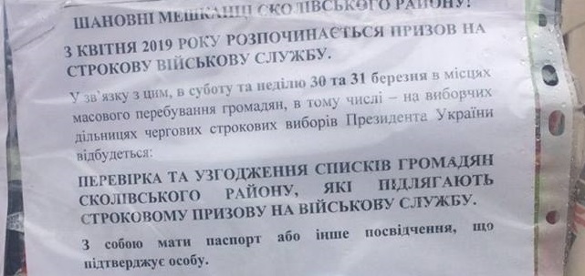У повідомленні сказано, що у Бродівському та Сколівському районах невідомі особи розклеїли оголошення, що у зв’язку з призовом на строкову військову службу, який розпочнеться у квітні, 30 та 31 березня у людних місцях — зокрема на виборчих дільницях — перевірятимуть та узгоджуватимуть списки громадян, які підлягають призову. Роздруківки формату А4 розміщені на стовпах та дошках оголошень.