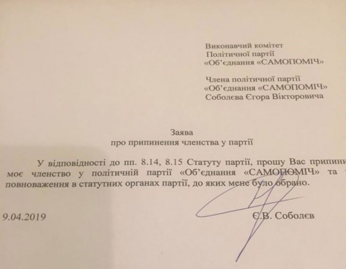Народні депутати Єгор Соболєв та Семен Семенченко, які буди обрані у 2014 році до Верховної Ради за списками об’єднання "Самопоміч", оголосили про намір вийти з партії.