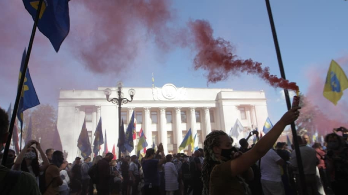 Під час акції під стінами ВР щодо законопроєкту про навчання державною мовою в закладах освіти люди запалили червоні фаєри.