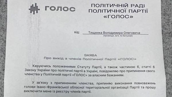 Голова Івано-Франківського осередку партії «Голос» Володимир Тищенко оголосив про складання повноважень і вихід з партії через тиск голови політсили Кіри Рудик.