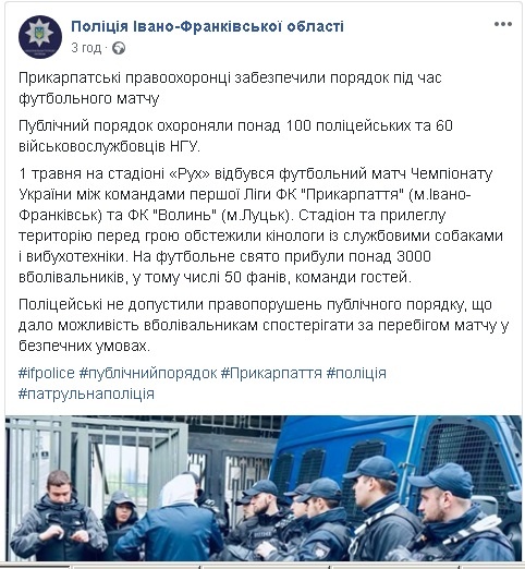 Пізніше цей пост чомусь зник, а на його місці з'явився інший - суттєво пом'якшений і без конкретики: «Рота ТОР управління патрульної поліції в Івано-Франківській області відповідно до Закону України «Про Національну поліцію» подбала про забезпечення публічної безпеки під час футбольного матчу «Прикарпаття» - «Волинь» на міському центральному стадіоні «Рух».
