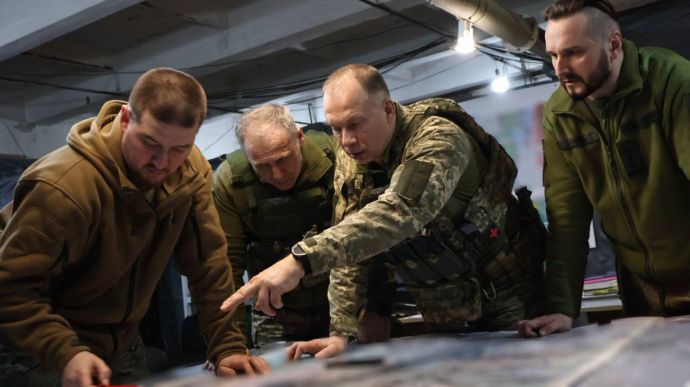 "Бахмутський напрямок. Наша оборона триває. Проїхав всією лінією зіткнення, був у частинах, які тримають весь бахмутський фронт/ Тут ми працюємо разом з командирами та воїнами над плануванням операцій, штурмових дій та оборони, контролюємо ситуацію безпосередньо на місцях...Ми б‘ємо ворога, часто несподівано для нього, і продовжуємо утримувати стратегічні рубежі", - написав Сирський у Telegram.