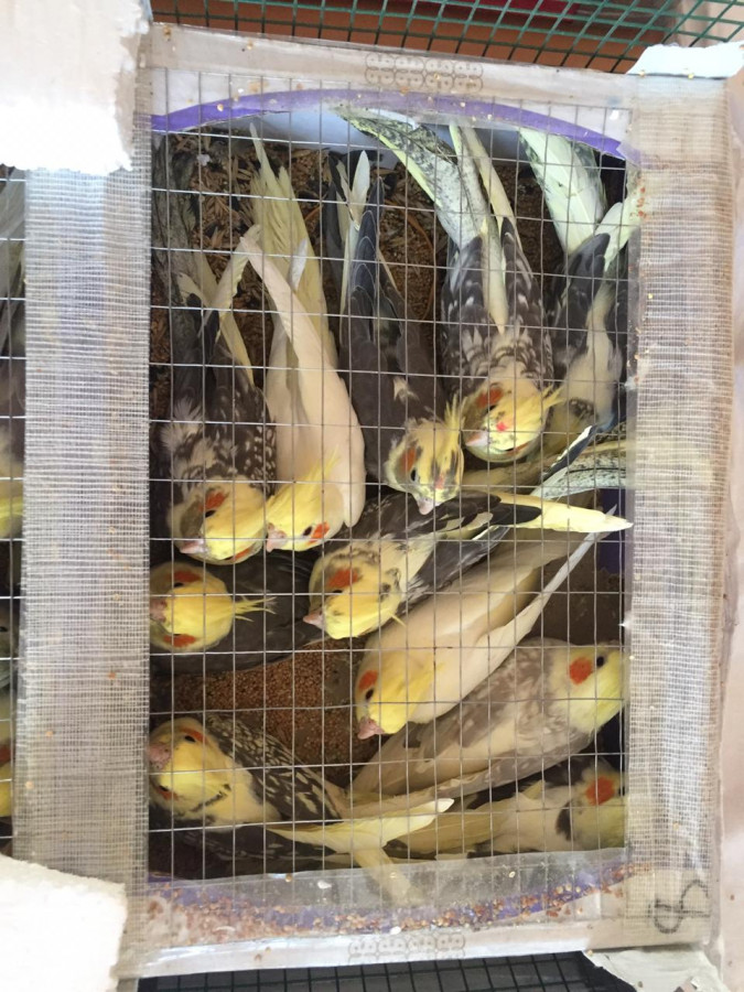 В подальшому, під час перевірки прилеглої до місця затримання місцевості, нарядом виявлено великий ящик, обладнаний пасками для зручності перенесення. Всередині ящика було шість коробок зі 150 папугами.