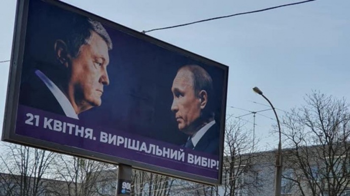 Нагадаємо, в Україні з'явилися біл-борди, сіті-лайти та газети із зображенням Петра Порошенка навпроти Володимира Путіна зі словами про "вирішальний вибір" 21 квітня. Таким чином, чинний президент натякає, що в другому турі виборів вибирати доведеться не між ним і Володимиром Зеленським, а між свободою України і реваншем Кремля.