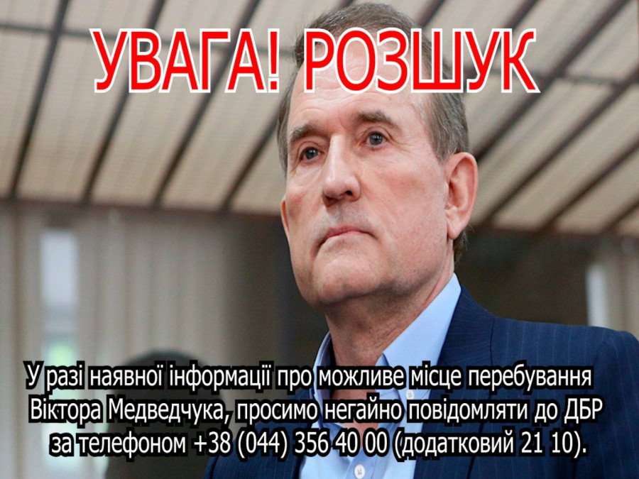 Звертаємося до українців які перебувають на території держави та за її межами, у разі наявної інформації про можливе місце перебування Віктора Медведчука, просимо негайно повідомляти до ДБР на електронну адресу inform.dbr@gmail.com та за телефоном +38 (044) 356 40 00 (додатковий 21 10).