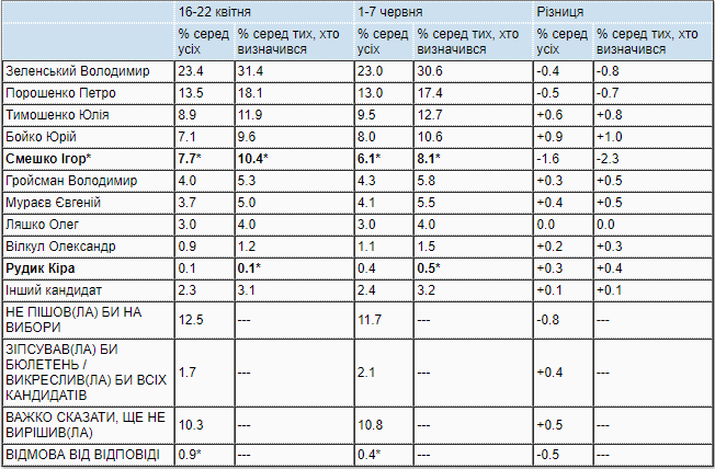 Порівняно з квітнем лише у випадку І. Смешка і К. Рудик простежуються зміни –рейтинг І. Смешка знизився з 10,4% серед тих, хто визначився, до 8,1%, а рейтинг К. Рудик – зріс з 0,1% до 0,5%. Зміна підтримки інших кандидатів – у межах статистичної похибки, тобто формально поточні рейтинги не відрізняються від рейтингів станом на 16-22 квітня.