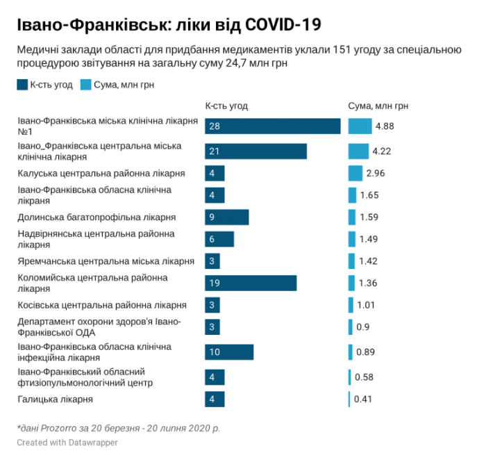 За даними Prozorro, найбільше ліків від 20 березня до 20 липня поточного року замовила Івано-Франківська міська клінічна лікарня №1, яка уклала 28 угод на 4,88 млн грн. Лікарня визначена як опорна лікарня для лікування хворих на COVID-19. Тут загалом є 240 ліжкомісць, а при потребі можуть додати ще 40 інфекційних. У лікарні є чотири апарати для штучної вентиляції легенів.