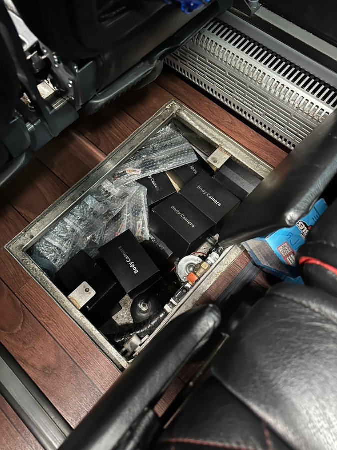 Під час огляду автобуса працівники митниці виявили 240 цифрових годинників «Skmei» та 24 нагрудних відеореєсторатори, без ознак використання.