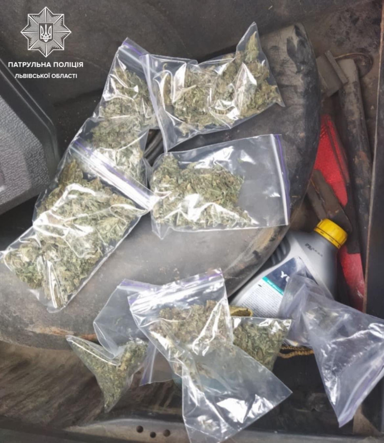 Під час перевірки транспортного засобу 22-річний керманич відкрив багажник та на вказівку патрульних показав відділення для запасного колеса. Там інспектори виявили поліетиленовий пакет, у якому було близько 10 зіп-пакетів з речовиною зеленого кольору, рослинного походження.