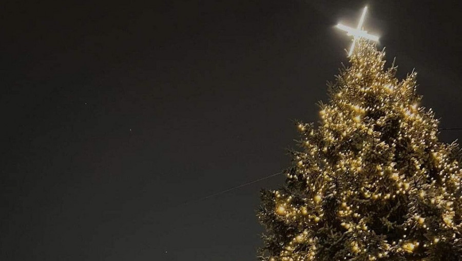 У Львові засвітили головну міську ялинку. Верхівку дерева цьогоріч прикрасили стилізованим протитанковим їжаком