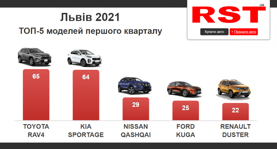 Лідером серед брендів у січні-березні був Toyota. Майже 120 таких нових автомобілів отримали реєстрацію у регіоні. Крім цих авто часто обирали Kia, Renault, Skoda і Nissan, – йдеться у рейтингу сайту з продажу автомобілів RST.ua.