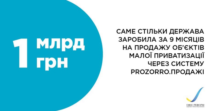 Із моменту старту малої приватизації восени 2018 року до бюджетів країни усіх рівнів надійшов 1 мільярд гривень.