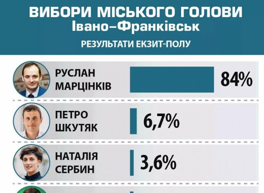 Чинний мер Івано-Франківська Руслан Марцинків перемагає в першому турі з показником 84%. Такі дані екзит-полу оприлюднено ГО "Центр розвитку ініціатив".