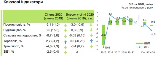 І далі: Показники промвиробництва також помітно погіршилися. «У січні 2020 року в промисловому виробництві було зафіксовано падіння на рівні 5,1%, в урахуванням ефекту календарних днів - «мінус» 4,7% в умовах дії як тимчасових, так і системних негативний чинників», - йдеться у висновку аналітиків.
