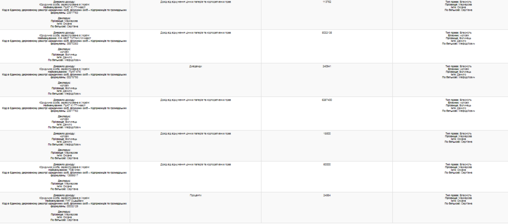 Але, незважаючи на це, продовжила декларувати мільйонні доходи від операцій з участю своєї колишньої компанії. Джерела її доходів, крім офіційної заробітної плати: ТОВ "Мультіброк", ТОВ "Мередіансіті", ТОВ "Клен", ЗАТ "Інвестиційна Компанія" ITT-Інвест "і ВАТ КІФНВЗТ" Титаниум-Інвест "ТОВ" УК-Центр ".