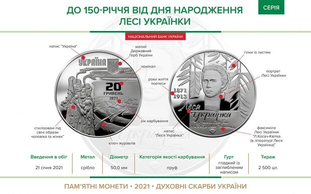 Національний банк із 21 січня 2021 року вводить в обіг пам’ятну монету “До 150-річчя від дня народження Лесі Українки”.