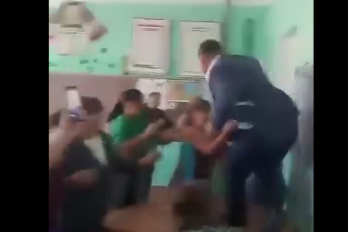 На кадрах видно, як група жителів зі шарпаниною і вигуками «Геть!» виганяли директора зі школи.