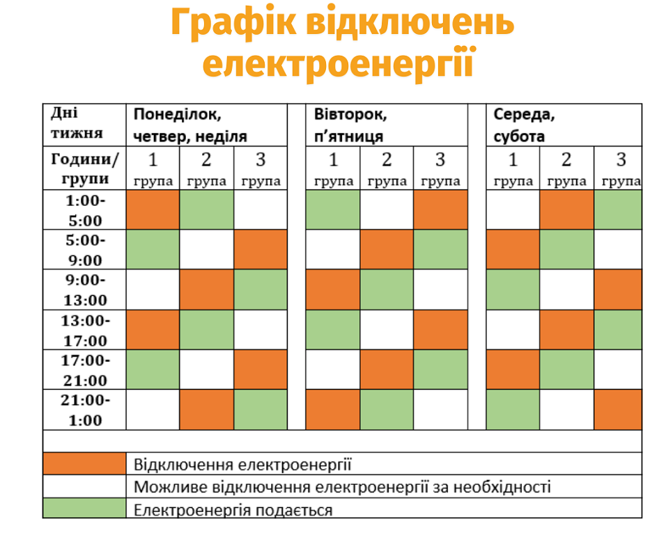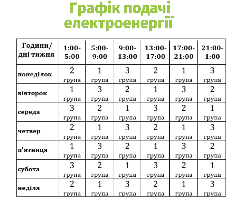 Графік подачі електроенергії розроблений для трьох груп споживачів, перелік оновлений та скоригований. Ознайомитись з графіком для кожної з груп споживачів за днями тижня можна на сайті ПрАТ "Львівобленерго" у розділі "Чому немає світла". Також тут можна дізнатись, до якої групи відключень належить ваш будинок.