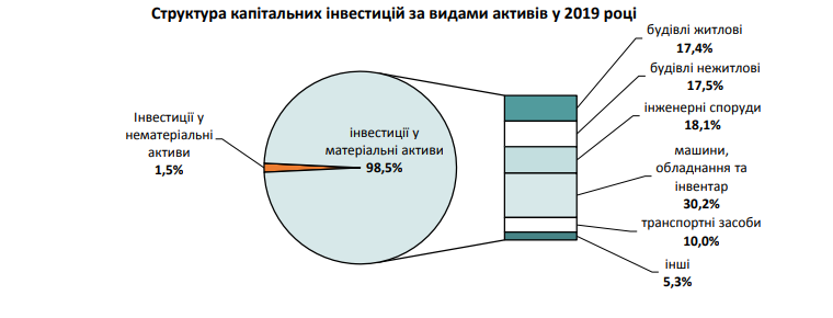 В обсязі капітальних інвестицій за видами активів переважну частку становили інвестиції у матеріальні активи (98,5%). З них на будівництво нових, реконструкцію та придбання існуючих житлових будівель торік було спрямовано 5401,5 млн.грн, або 17,4% усіх інвестицій, тоді як у 2015 році їх частка становила 30,1% від загального обсягу.
