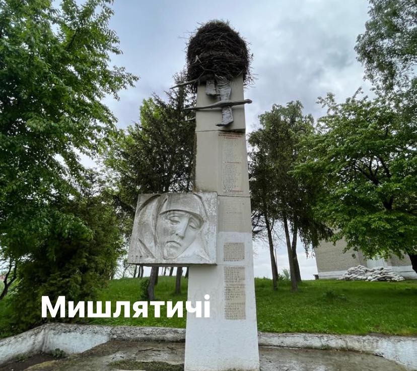 "У Мишлятичах демонтаж перенесли. Бо на монументі – гніздо лелек. Птахи цьогоріч уже, на щастя, тут не гніздяться, але в гості навідуються. Наразі місцеві кілька тижнів будуть спостерігати, а якщо бузьки таки тут живуть, - будемо радитися з орнітологами, як переселити птахів деінде", – розповівдепутат Львівської обласної ради Захар Миляник.